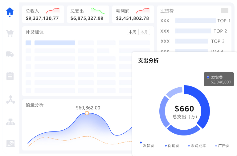 支持按 产品、订单、店铺、平台为维度计算毛利润,支持导入费用,核酸净利润
